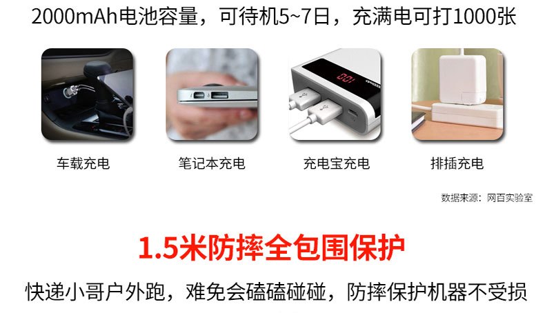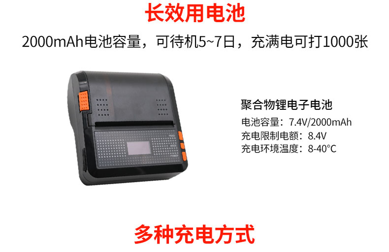 7.4V/2000mAh可充电聚合物锂电池,支持外接电源打印 |