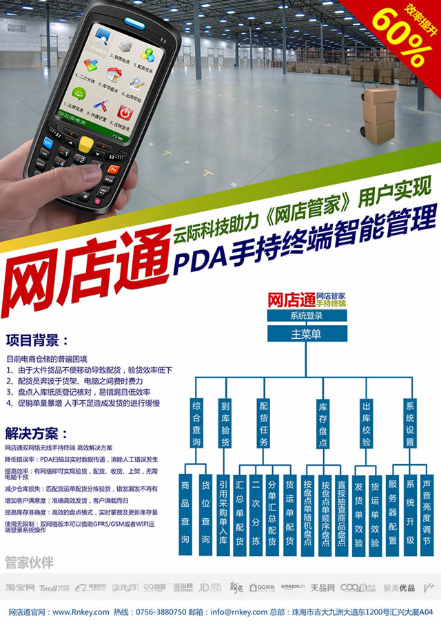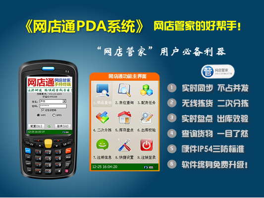 网店通PDA对接于es86 《网店管家》3.1版,主要功能有:商品查询、货位查询、采购开单、到库验货、汇总单配货、二次分拣、分单汇总配货、货运单配货、按盘点单顺序盘点、按盘点单随机盘点、直接抽查商品盘点、出库效验{订单模式|运单模式}、打包员登录、商品有效期、配货派工等。网店通PDA主要利用可移动,可扫描,携带方便的优势处理PC端无法处理或者处理困难的任务。