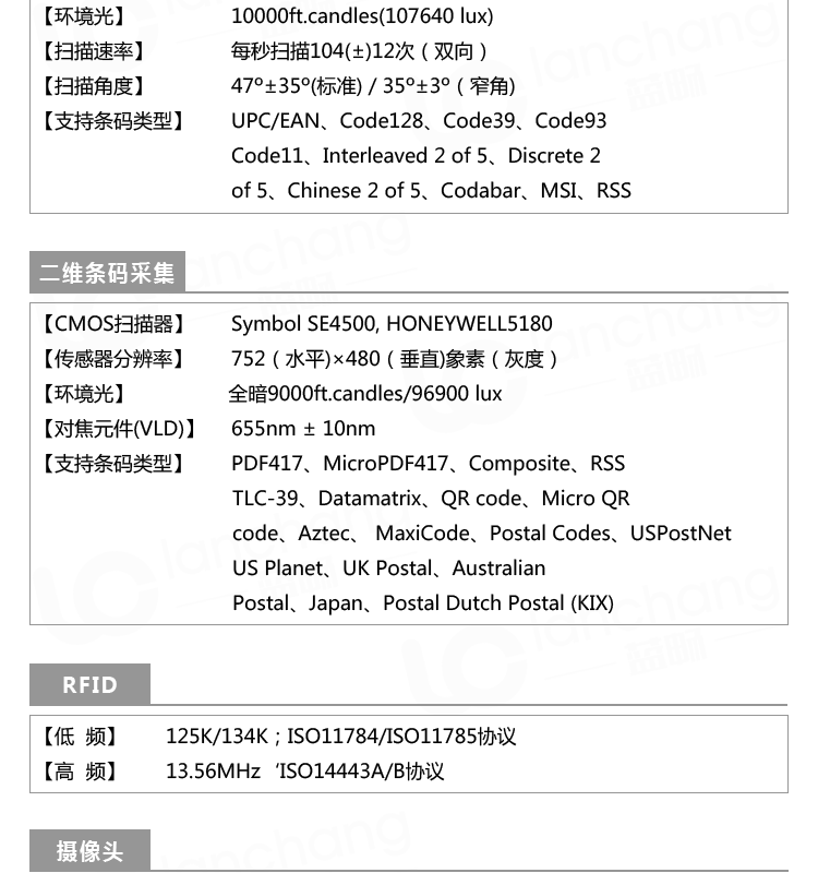 650nm可见激光二极管,支持全部一维码制,二维条码: PDF417、microPDF417、MaxiCode, DataMatrix (ECC 200)、Composite Codes 和QR Code以及邮政编码(扩展)